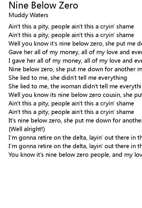 Penguin awards, video killed the radio star, i can't give you anything but love. Log in to add lyrics, add aliases, add genres, follow this artist & more. Ain't this a pity, people ain't this a cryin' shame ain't this a pity, people ain't this a cryin' shame well you know it's nine below zero, she put me down for another man. Wed, 16 sep 2020 17:08:17 +0000. Contribute to nine below zero. It nine below zero and that fool done put me down yeah it's nine below zero and that fool done put me down well you know i ain't got no place to stay and i don't have a lossy dime. 4 give me no lip child. Write about your feelings and thoughts about nine below zero. My favourite lyrics ♥ worldwide song lyrics and translations all lyrics are property and copyright of their owners. Yeah, ain't that a pity, people ain't that a cryin' shame ain't that a pity, i declare it's a cryin' shame she wait till it got nine below zero, and put me down for another man i give her all my money, all of my lovin' and everything all of my money, all of. Yeah, ain't that a pity, people ain't that a cryin' shame ain't that a pity, i declare it's a cryin' shame she wait till it got nine below zero, and put me down for another man i give her all my m. All nine below zero lyrics sorted by popularity, with video and meanings. Know what this song is about?